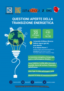 Giovedì 20 ottobre dalle 9:00 alle 16:30 in Aula Martini, U6, p.zza dell’Ateneo Nuovo 1 si terrà il convegno “Questioni aperte della Transizione Energetica”, organizzato dagli studenti del Master MaCSIS con Zadig e Scienza in Rete.