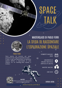 Venerdì 5 maggio alle ore 12:00 Paolo Ferri, ex Responsabile delle Operazioni spaziali dell’ESA, terrà la master class “La sfida di raccontare l’esplorazione spaziale”. L’evento si terrà nel lab.712, I piano U7, via Bicocca degli Arcimboldi 8.