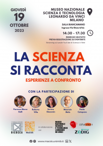 Giovedì 19 ottobre dalle 14:30 alle 17:30 in Sala Biancamano, Museo Leonardo da Vinci, via Olona 6/bis si terrà il convegno “La scienza si racconta”, organizzato dagli studenti del Master MaCSIS con Zadig, Scienza in Rete e il Museo Nazionale della Scienza e Tecnologia Leonardo da Vinci.